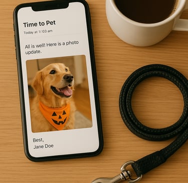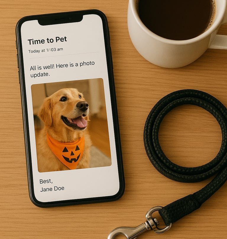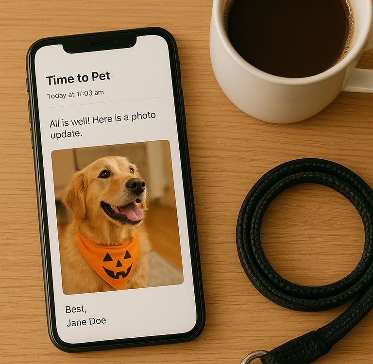 Youāll always know how your pupās walk went, thanks to our Time to Pet app. After each visit, we share a detailed report and photos ā so you can feel close, even when youāre away.